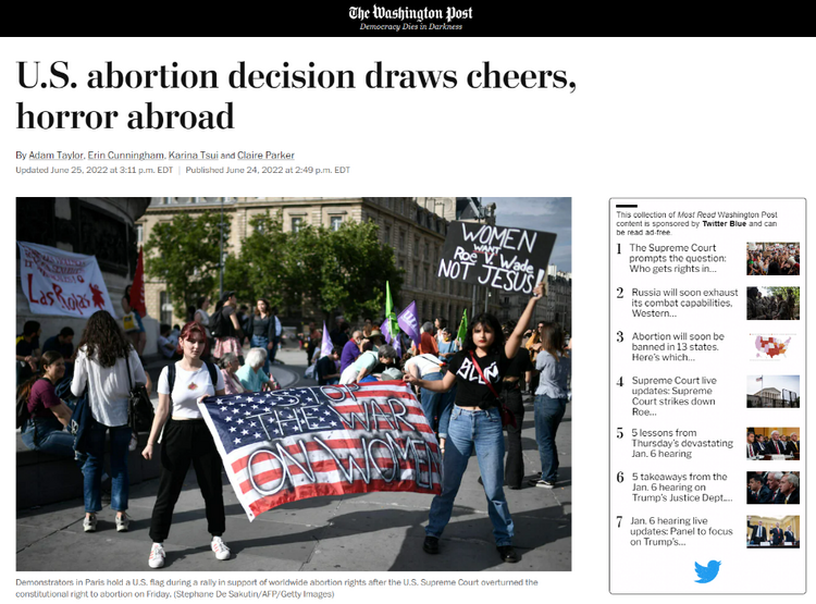 6月25日发表报道称,除了引起本国争端,世界各国领导人与堕胎权拥护者们纷纷将美最高法院的裁决描述为“可怕的” 、“骇人听闻的”。伦敦、巴黎、渥太华等多座城市爆发。报道举例称,苏格兰政府首席大臣妮古拉·斯特金发布推特表示:“这是我此生经历过的、对女性权益而言最黑暗的一天”。英国首相约翰逊则强调该裁决显然将对全世界人民的观念产生重大影响,是“向后退了一大步”。加拿大总理特鲁多则认为美最高法院的决定是“可怕的”,“没有任何一个政府、一个政客、或是一个男人应当告诉一个女人她可以如何使用自己的身体”。